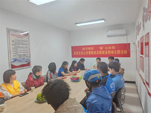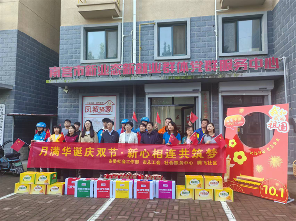 在中华人民共和国成立76周年与中秋佳节来临之际,为弘扬爱国主义精神,传递党和政府对新业态新就业群体的关心关爱,南宫市总工会联合市委社会工作部、社会服务中心开展“双节同庆 新‘心’向党”慰问新就业群体主题活动,为奔波在一线的新就业形态劳动者送去节日祝福与关怀。
