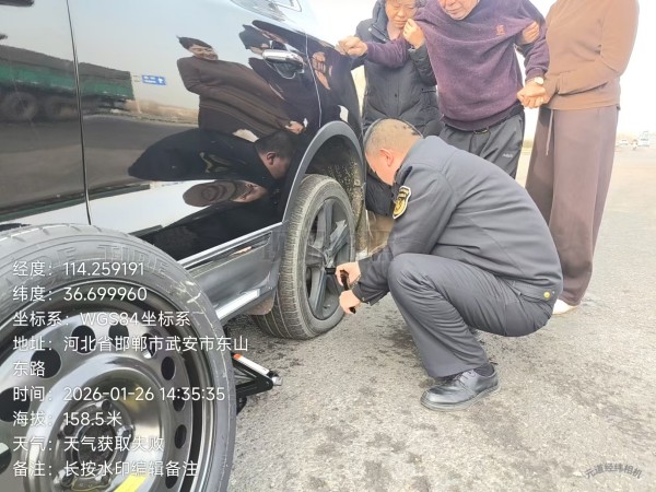 2026年1月26日下午,武安市东二环工业园区路段上演暖心一幕:一辆外地来武办事的小车因左后轮爆胎,停靠在路边。车上人员缺乏换胎经验,同行老人焦急无措。此时,正在该路段开展日常巡查的武安市交通运输综合执法大队一中队队员发现异常,立即停车上前询问。