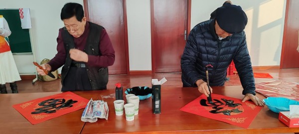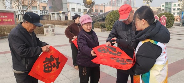 一幅幅饱含深情的春联、一个个寓意吉祥的“福”字在书桌上渐渐铺开。志愿者们小心翼翼地将墨迹未干的作品轻轻拿起,仔细平铺在通风处晾干,随后分门别类地收集整理,确保每一幅作品都平整完好。待所有春联福字收集完毕,志愿者们将其整理打包和提前印刷好的福字春联,运往献县文化广场。在广场上,他们热情地将这些满载祝福的作品送到前来领取的职工群众和沿街商户手中,一张张笑脸在红底黑字的映衬下显得格外灿烂,整个广场都洋溢着浓浓的年味和温馨的氛围。