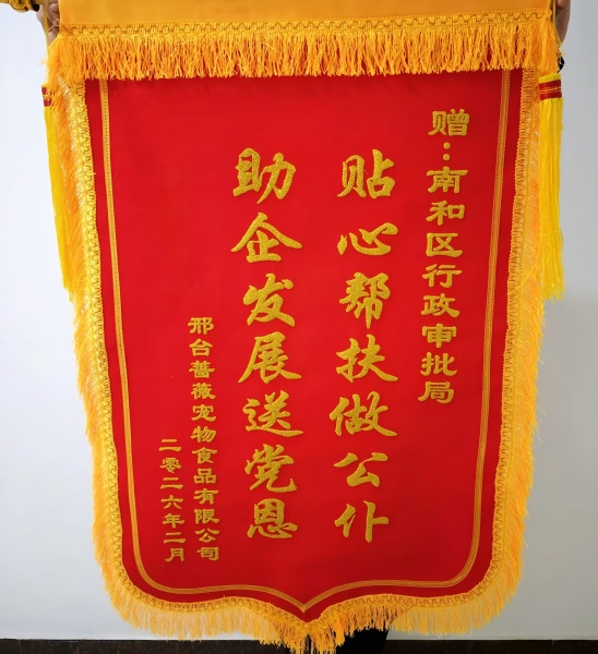 近日,邢台市南和区蔷薇宠物食品有限公司负责人陈相坤专程将一面写有“贴心帮扶做公仆 助企发展送党恩”的锦旗送至邢台市南和区行政审批局工作人员手中,对该局在公司证照办理过程中提供的专业、高效、暖心服务表示衷心感谢。