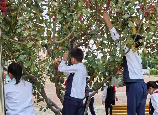 同学们化身“采摘小能手”,走进校园海棠林。大家小心翼翼地踮起脚尖,摘下挂满枝头的海棠果,红彤彤的果实装满了篮子,也装满了同学们的成就感。