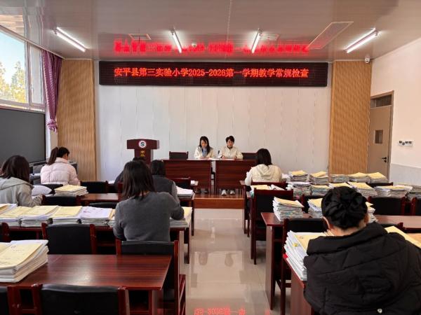 教学常规是提升教学质量的核心抓手。 为进一步规范学校教学管理,落实新课程标准要求,提升教师教学业务水平,保障教学工作有序、高效开展,全面提高教育教学质量,安平县第三实验小学于11月20日开展全校教学常规专项检查,校领导牵头、教务处联合各学科教研组长组成检查组,对1-6年级各学科教案、反思、听评课、作业等环节进行全面核查。