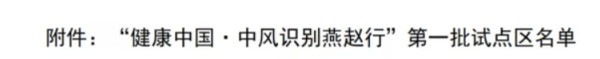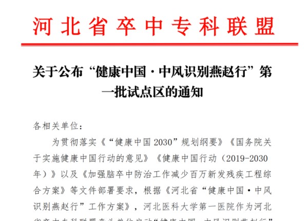 为落实《“健康中国2030”规划纲要》等文件要求,依据《河北省“健康中国·中风识别燕赵行”工作方案》,河北医科大学第一医院作为河北省卒中专科联盟牵头单位,启动了该行动试点单位(地区)建设工作。此次行动经材料审核、现场汇报及专家论证,最终确定15个区(县)和5个国家“健康中国 中风识别”行动试点区为首批试点单位(地区)。