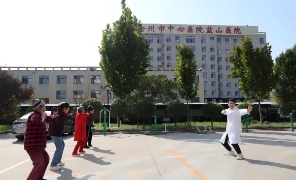 活动伊始,盐山医院执行院长、心血管内科主任医师李永星围绕老年人高发心血管疾病科普病因预防、日常护理及紧急应对要点;康复理疗科主治医师陈保丞则讲解穴位按摩的益处,并针对性指导“穴位调理对应病症”,内容实用易懂,老人们认真聆听。随后,护理部闫倩带领老人们做轻柔健康操,边做边喊“抬手、拍腿,1234”。另一边,陈保丞医师则带领老人在院子里练起了八段锦,舒缓的音乐响起,老人们跟着抬手、伸腰、踢腿,虽然动作不算标准,但每个人都格外认真,阳光洒在她们脸上,满是惬意。