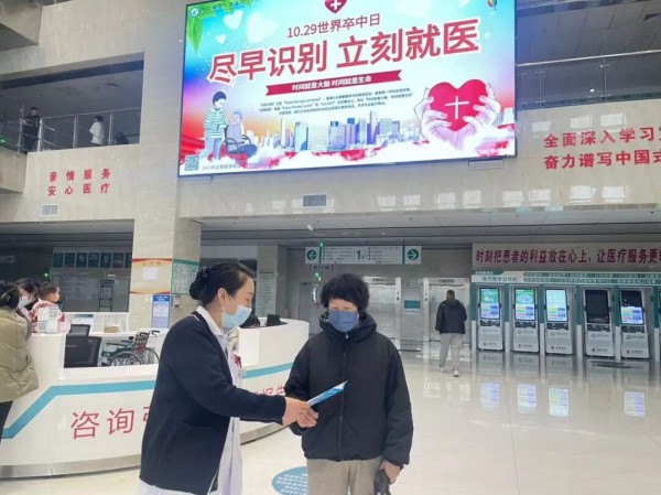 10月29日上午的医院门诊大厅,在醒目的电子显示屏专题海报指引下,“健康服务直通车”的宣教小分队早已准备就绪。由宣教部牵头,联合内二科、内四科、急诊科、患者服务部组成的宣教团队,面向往来就诊的患者与家属,发放精心编排的《卒中防治健康知识手册》。