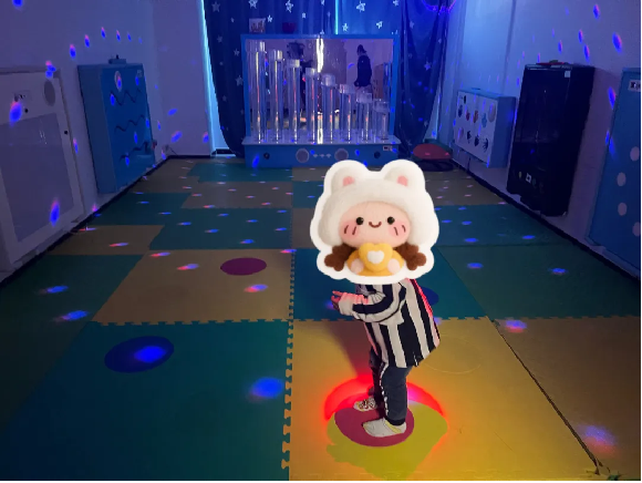 一次偶然康复师发现小雨点对光影特别敏感,于是带着他玩起了“追光”游戏。康复师一边操作光源打出光斑,一边慢慢引导小雨点跟着光斑移动。没过多长时间,小雨点就有了进步,从一开始只能看光斑一两秒,发展到能够专注地追着光斑跑起来。