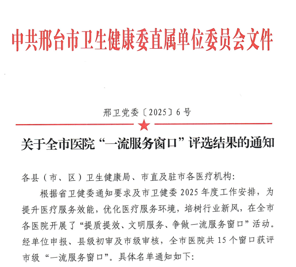 邢台市卫健委依据省卫健委通知要求及2025年度工作安排,为进一步提升全市医疗服务效能、优化医疗服务环境、培树行业新风组织开展了此次评选活动。评选严格遵循单位申报、县级初审、市级审核的流程,经过层层筛选、综合考评,最终全市仅有15家医院窗口获此殊荣。