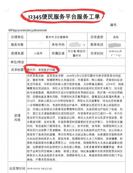 “12345热线既是反映诉求的渠道,更是传递温情的桥梁。”这份特殊的致谢工单,不仅是患者对肾内科医护人员专业服务的高度认可,更是医患之间心与心交融的生动见证,此次患者家属通过12345热线表达的谢意,将成为激励医院全体医护人员继续前行的动力。