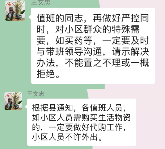对此,院长做出这样指示:如小区人员需购买生活物资,一定要做好代购工作。对小区群众的特殊需要,如买药等,一定要及时与带班领导沟通,请示解决办法,不能置之不理。