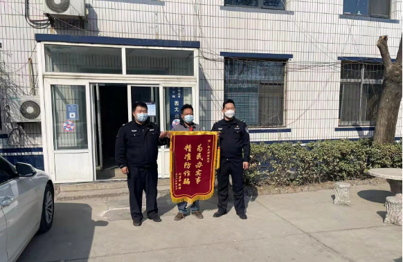网上河北讯2022年3月10日,刘先生将一面写有“为民办实事,精准防诈骗”的锦旗送到西大街派出所民警魏子宽、辅警吴海东的手中,以表达对民警为其妻子挽回2万元损失的衷心感谢。