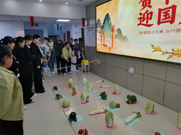 为增添活动的趣味性,让活动更加接地气,社区特别设置了“趣味套蔬菜圈”游戏。地上整齐地摆放着茄子、白菜、土豆、洋葱、红薯等各式新鲜蔬菜作为“目标”。只见他们瞄准目标,手腕轻抖,塑料圈在空中划出优美的弧线。这项活动简单而充满挑战,不仅唤起了许多居民的童年记忆,更将健康生活的理念与乐趣相结合,让居民在游戏中“圈”住了快乐,也“套”回了实实在在的绿色健康食材。