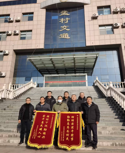 12月15日,孟村县新县镇南肖庄村村委会负责人带领村民代表,将两面面印着“驻村下沉助振兴、实干惠民暖人心”和“踏踏实实干实事、勤勤肯肯这村民”的鲜红锦旗,送到县交通运输局,以此表达全村群众对县交通运输局下沉工作队倾心帮扶的感激之情。