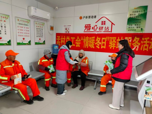冬至寒意浓,人间温暖情。为充分发挥工会驿站阵地作用,体现工会组织对户外劳动者群体的关怀关爱,12月21日冬至日当天,孟村回族自治县总工会在工会驿站开展“情暖冬日”关爱服务活动。驿站全天提供热水、歇脚等服务,并为环卫工人、外卖骑手等送上爱心取暖贴,将温暖精准送到户外劳动者身边,细心叮嘱他们注意防寒保暖。