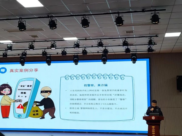本次讲座是学校法治安全教育的重要一环。活动中,法治副校长用一个个真实的案例,以案说法,深入浅出地为同学们剖析了各类安全隐患。他告诫同学们,网络世界虚拟复杂,务必做到“不轻信、不透露、不转账”,遇到诈骗时如何正确应对,保护好个人和家庭的信息,争做“反诈小卫士”。