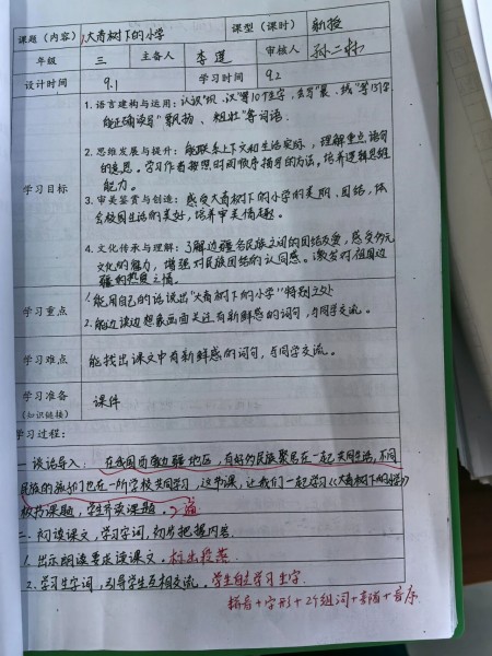 凡事预则立,不预则废。教案是教学的蓝图,是提高教学质量的前提和基础,是让“双减”政策真正落地的有力保证。老师们能在新课标理念的指导下认真备课,教案书写规范美观,教学流程层次清晰、环节完整,教学重难点把握准确到位,注重教学评一体化。教学反思书写及时,真实具体。