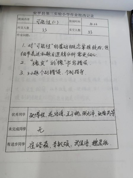 作业作为课堂教学的延伸,是学生学习态度的直接体现,也是教师教学反馈的重要依据。学生作业干净整洁,教师批阅及时,纠错规范,尤其是老师多元化的等级评价,激发了学生的学习兴趣,提高了作业完成质量。此外,教师们能及时进行作业批改和学生辅导情况的记录,细致、认真地做好教育教学的每一个环节。