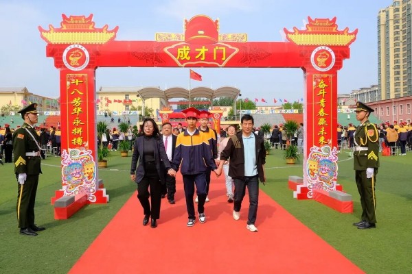 武强县团县委书记孟玉、武强县教育局副局长崔月龙、武强中学党总支书记吴占宗、校长贾瑞峰及学校领导班子成员、武强县爱心人士——衡水市第七届人大代表程永辉、高二全体师生及家长齐聚田径场,共同见证同学们迈向成年、逐梦成长的重要时刻。