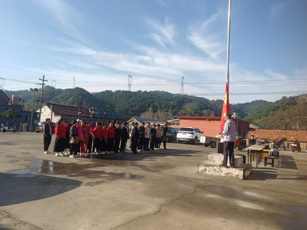 雄壮的《义勇军进行曲》奏响,鲜艳的五星红旗缓缓升起、猎猎飘扬。全体人员怀着崇高的敬意凝视国旗行注目礼,齐声高唱国歌,以嘹亮歌声传递对祖国的深切热爱与真挚祝福。与此同时,全镇各村同步举行升国旗仪式,村民代表、党员干部齐聚村部广场,共同见证国旗升起的庄严时刻,让爱国主义情怀在乡村大地处处传递。