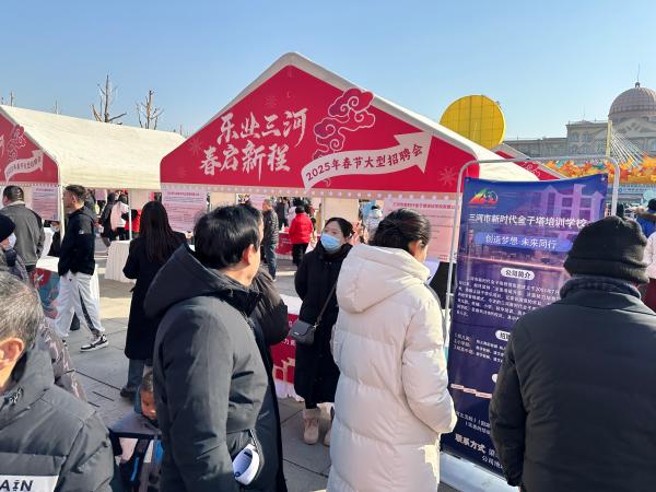 2月10日,“乐业三河,春启新程”2025年春节大型招聘会在三河市文化中心广场举办,110家企业参与招聘,提供涵盖生物制药、生产制造、现代服务等多个领域的3500个优质岗位,吸引了8000余名求职者,现场达成就业意向1200余人次。
