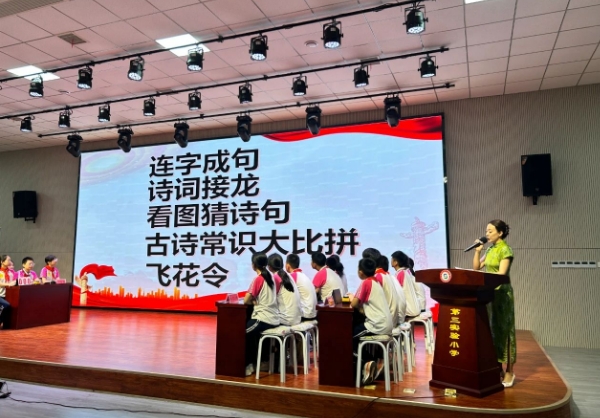 活动分连词成句、诗词接龙、看图猜诗、古诗常识大比拼和飞花令五个环节进行。比赛现场气氛活跃,参赛选手热情高涨,从容淡定,应答自如,展示出了孩子们深厚的诗词功底。