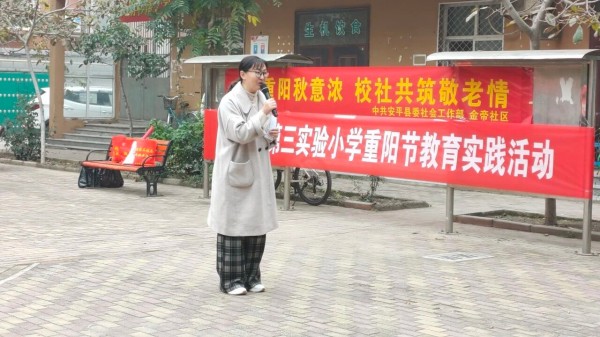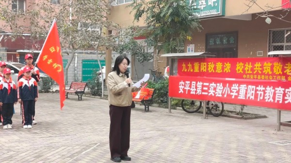 10月28日上午,晨光轻洒在金帝雅苑社区的广场上。安平县第三实验小学党支部书记刘晓丽带领党员代表以及家长代表和孩子们与社区老人共赴一场以“九九重阳秋意浓,校社共筑敬老情”为主题的重阳之约,让敬老美德在秋日里静静流淌。