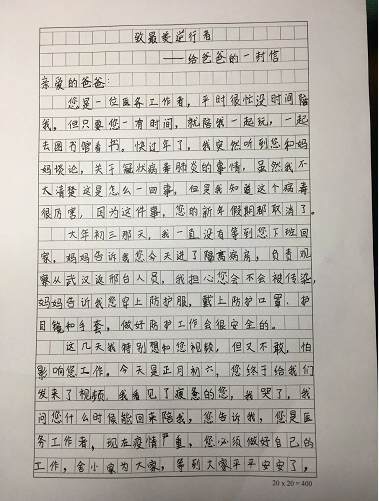大年初三那天,我一直没有等到您下班回家,妈妈告诉我,您今天进了隔离病房,负责观察从武汉返邢台人员。我担心你会不会被传染,妈妈告诉我您穿上防护服,戴上防护口罩、护目镜和手套,做好防护工作会很安全的。