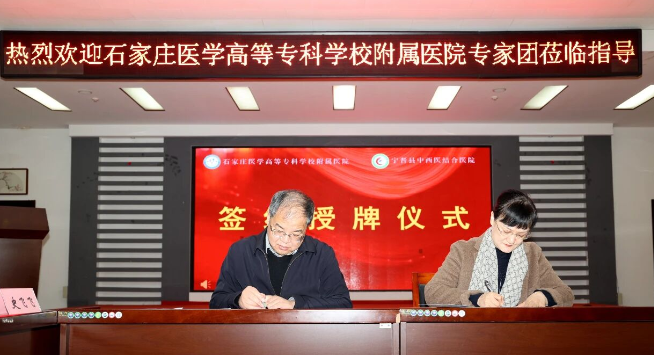 王永彬与张霞共同签署《医联体合作协议》,并完成授牌——宁晋县中西医结合医院正式成为“石家庄医学高等专科学校附属医院医疗联合体单位”。