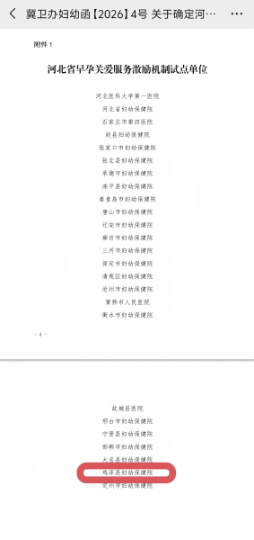 近日,依据《国家卫生健康委妇幼司关于报送早孕关爱服务激励机制试点单位和县级妇幼保健机构发展典型单位的通知》要求,经市级推荐与省级评审,鸡泽县妇幼保健院成功入选河北省早孕关爱服务激励机制试点单位,标志着医院在孕早期健康管理、生育友好服务与妇幼健康创新发展方面,获得省级权威认可。